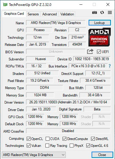 Графическая система: AMD Radeon Vega 8 (1 ГБ)