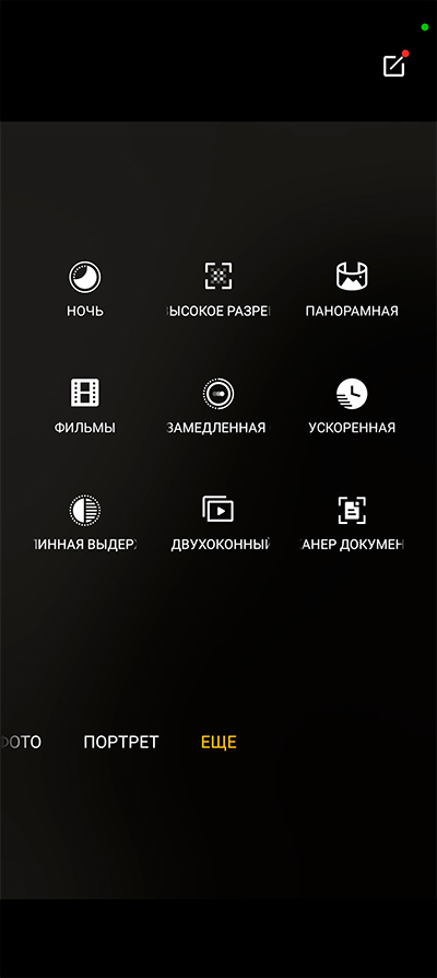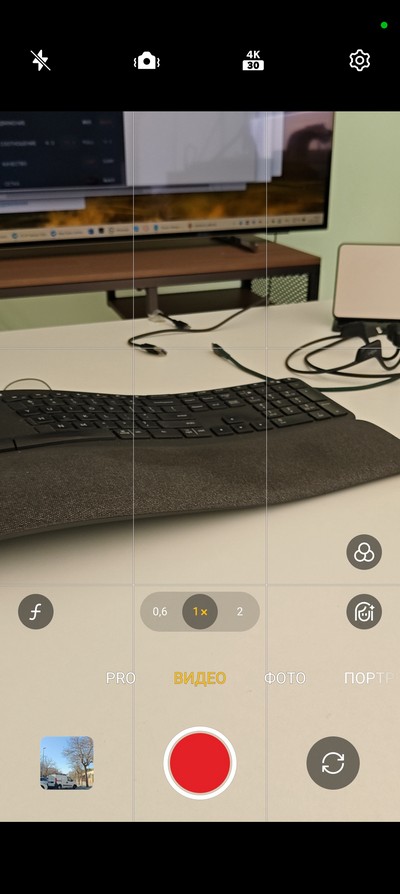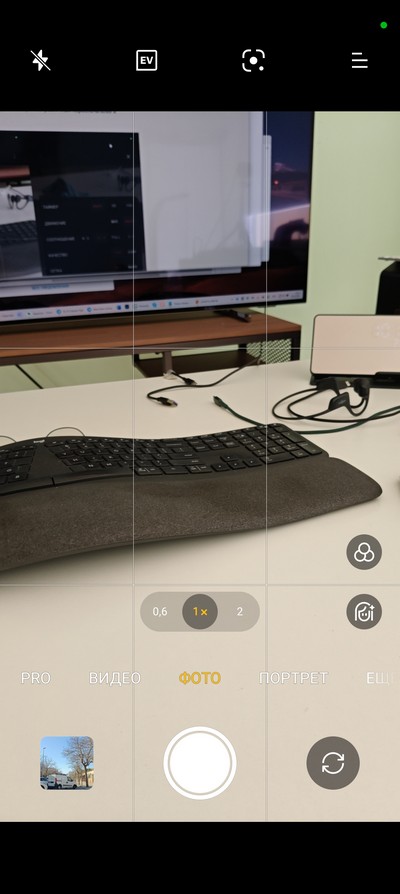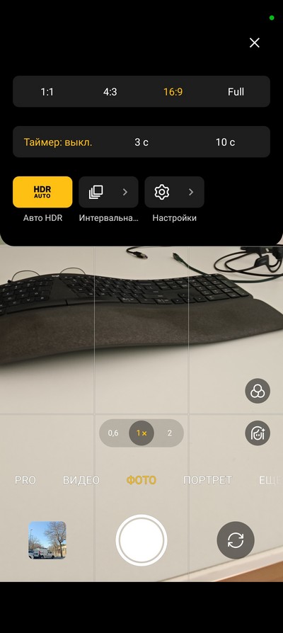 Интерфейс камеры. Снизу переключаются режимы: PRO, видео, фото, портрет, еще. Выше идет переключение между сверхшириком, основной камерой и цифровым зумом (по умолчанию 2-кратный, но можно вызвать линейку зумов и масштабировать до 10-кратного). Сверху - пиктограммы различных переключателей и пиктограмма меню.