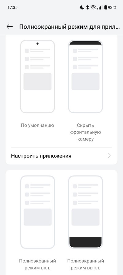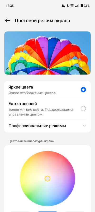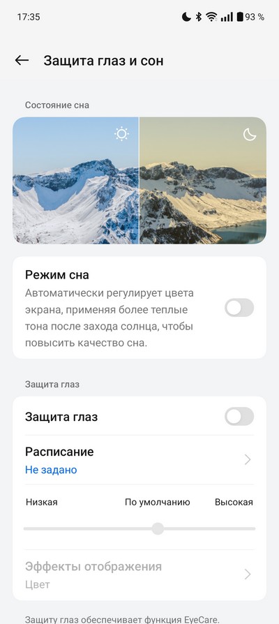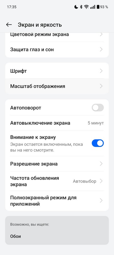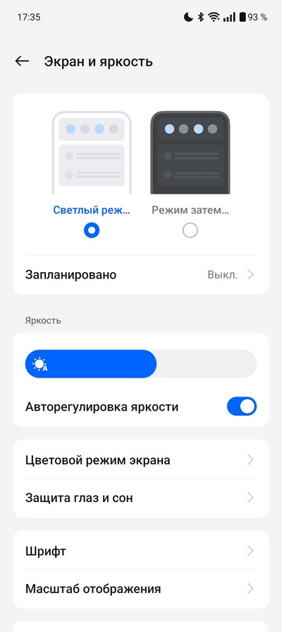 В настройках экрана можно включать темную тему, ночной режим, менять размер шрифта и масштаб, задавать частоту обновления экрана.