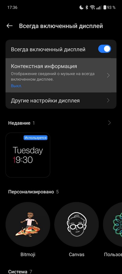 Настройки всегда включенного экрана - они располагаются в разделе "Обои и стили" (я их не сразу нашел).