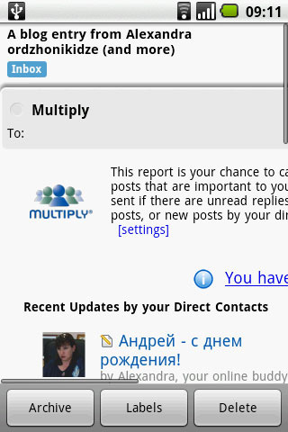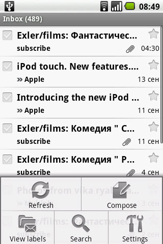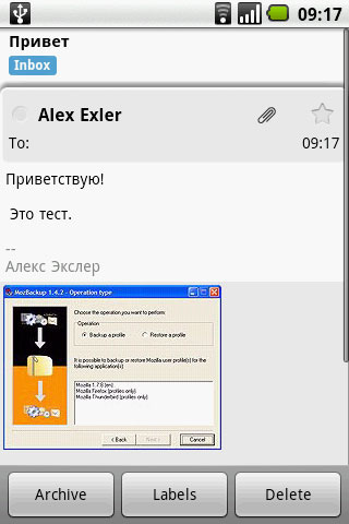 При создании нового письма нельзя вызвать список контактов (это не слишком удобно), однако при набирании адреса Android показывает подходящие варианты из контактов. К письму можно приложить изображение из галереи, а можно сделать кадр встроенной камерой и приложить только что сделанное фото.