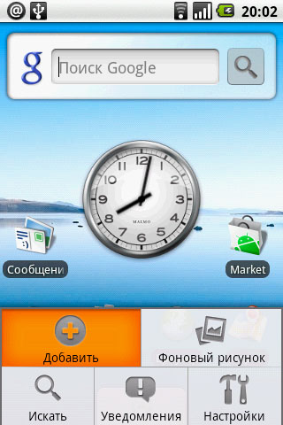 В данном варианте установлено два виджета - поиск с помощью Google и часы.