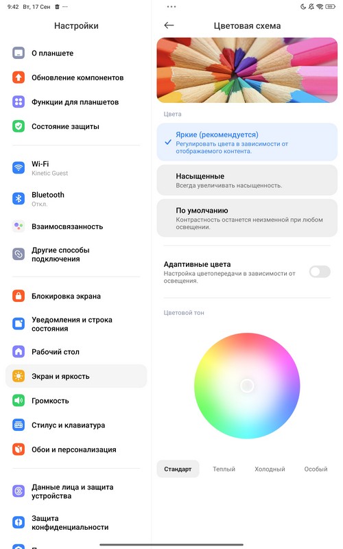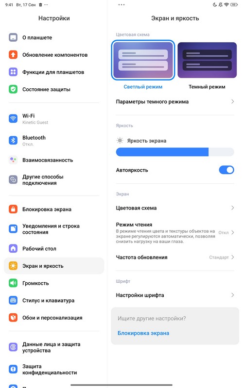 Настройки - обычные для оболочки Xiaomi. Есть темный режим, режим чтения (в том числе по расписанию), настраиваются цветовая схема и цветовой тон, настраивается размер шрифтов.