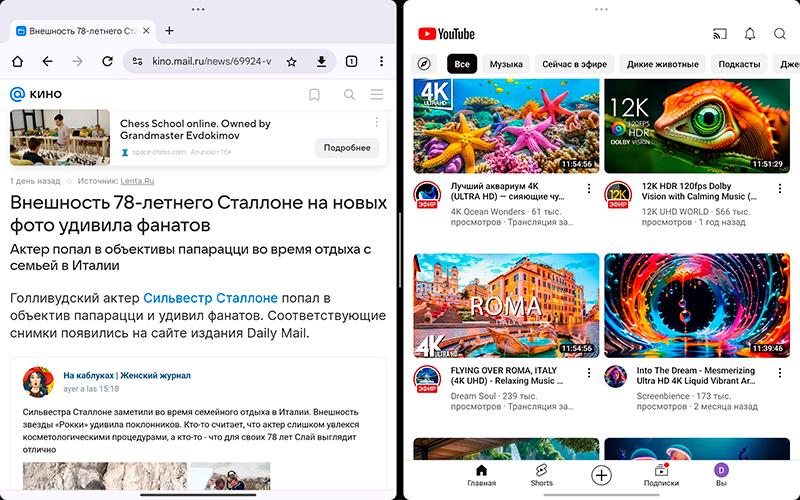 Также здесь есть удобный режим разделения окон - когда вы на одной половине экрана можете разместить одно приложение, на другой половине экрана - другое приложение, и также можете менять их пропорции.