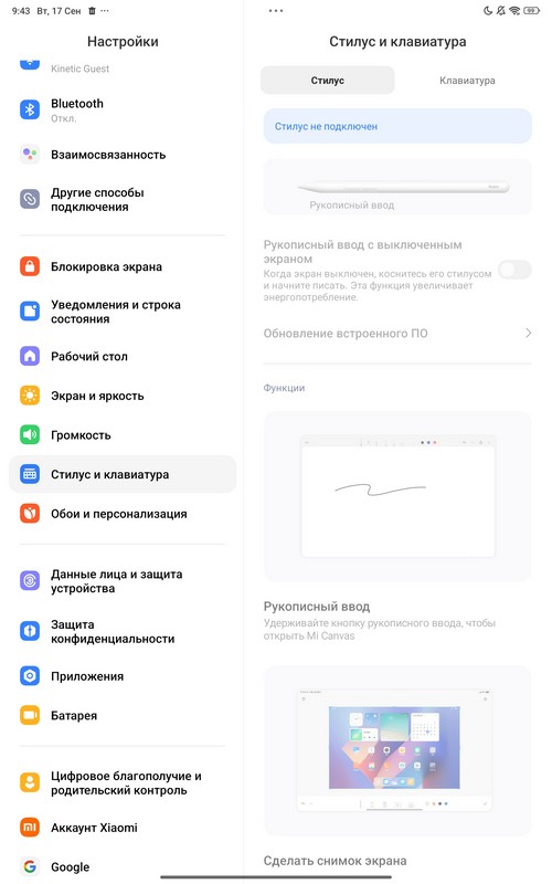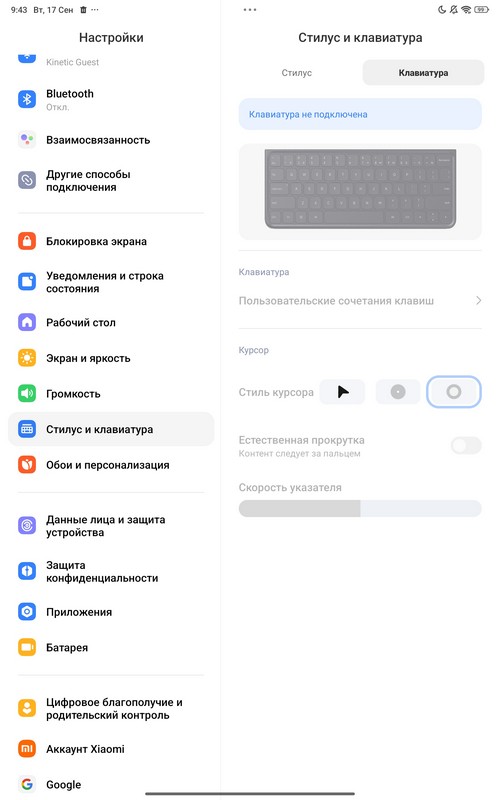 Ну и есть настройки для пера и подключенной клавиатуры.