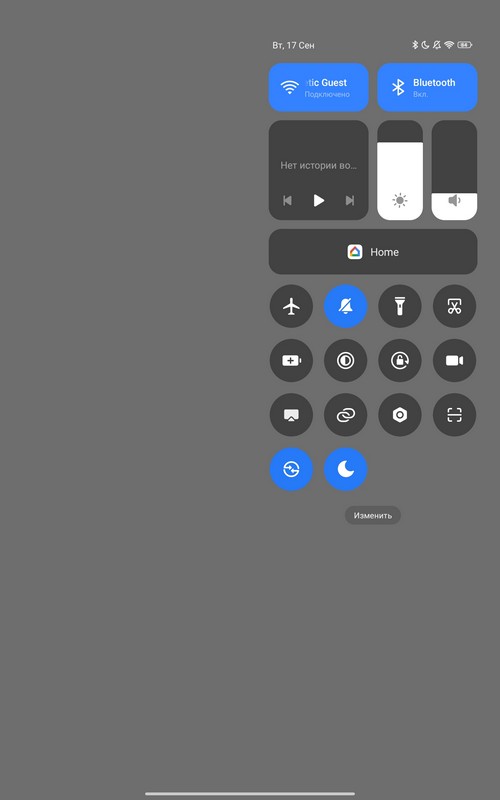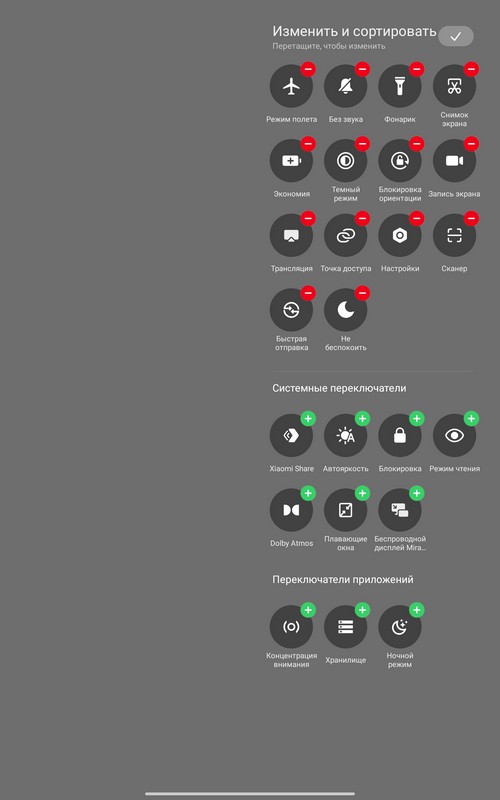 Центр управления и его настройки.
