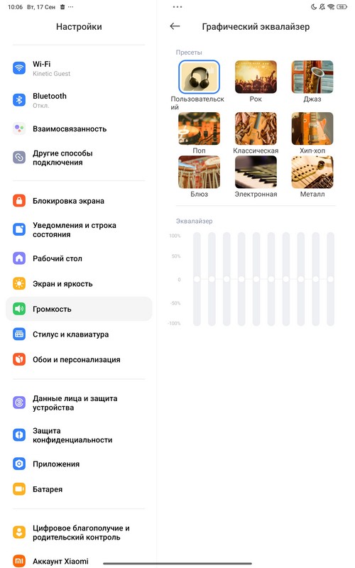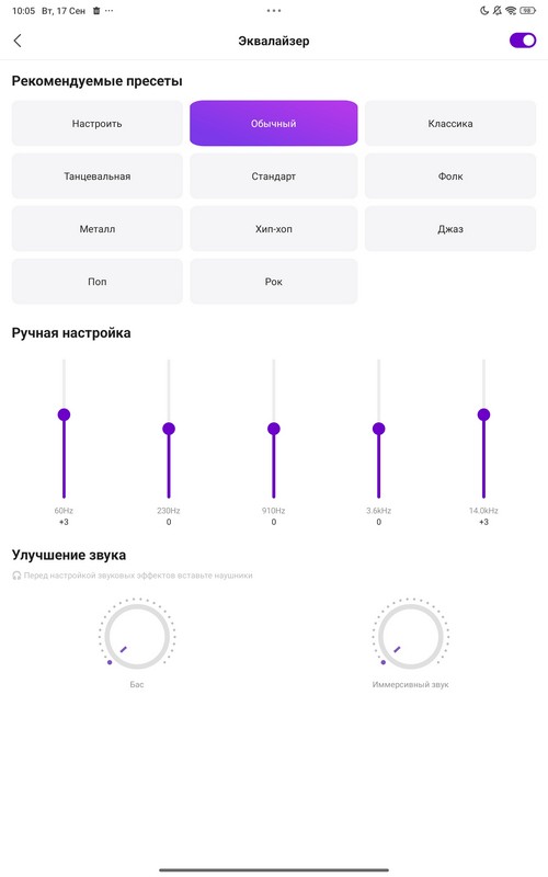 При использовании наушников можно включать Dolby Atmos, выставлять пресеты и настраивать эквалайзер. Использование Dolby Atmos немного добавляет низких и средних, но одновременно слегка сглаживает высокие. Иногда это улучшает звучание, иногда ухудшает - зависит от типа звука. Также режим Dolby Atmos создает определенный эффект объемного звучания.