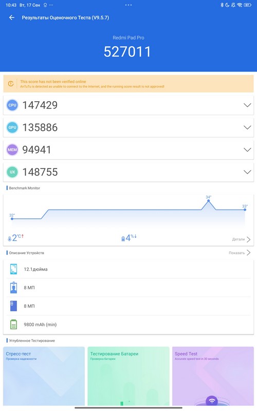 Стресс-тест AnTuTu. Температура батареи была ниже 40 градусов.