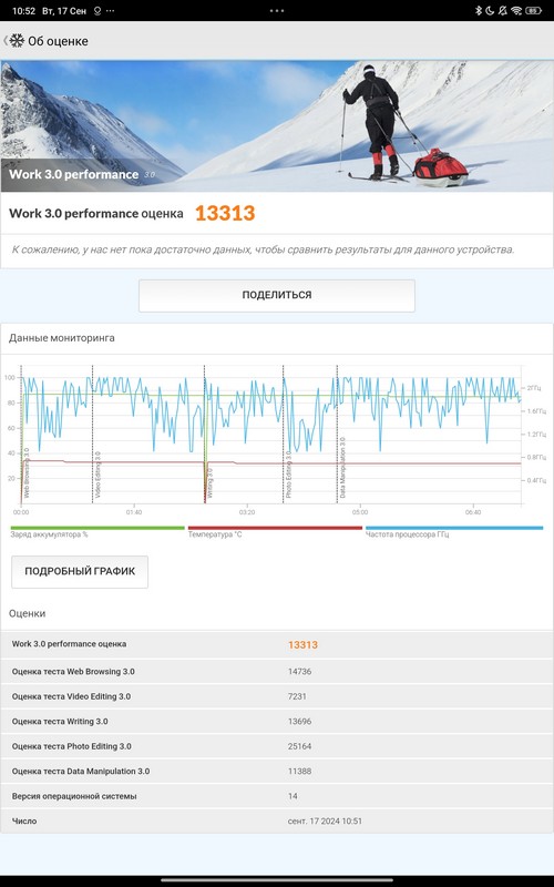 Синтетический тест PCMark у меня тут не прошел, в процессе все время вырубался - такое бывает. На GSMArena по своим тестам приводят 9 часов 36 минут работы планшета в смешанном активном режиме.