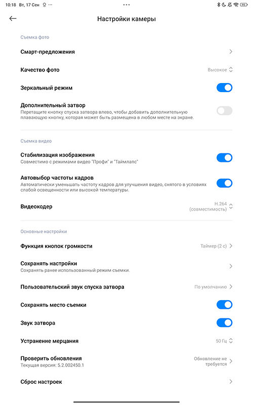 Настройки камеры.