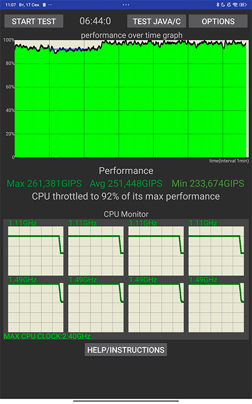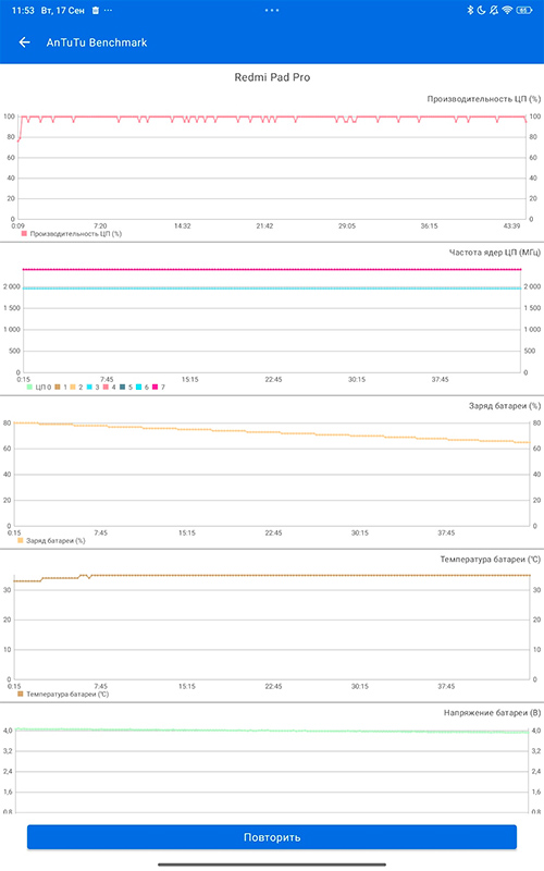 Тест на потерю производительности при нагрузке. Тут все хорошо, потери производительности практически нет. Задняя крышка планшета в процессе теста очень незначительно нагревалась в районе расположения процессора.