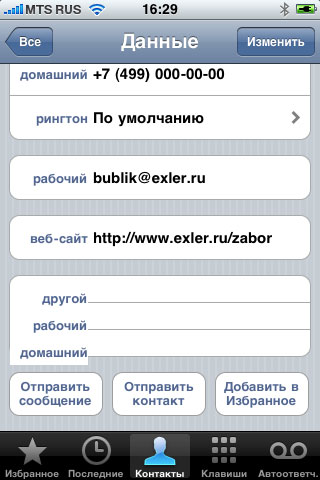 Контакт отправляется через MMS в виде приложенного к письму файла электронной визитки. На iPhone такие визитки получать очень удобно - их потом можно превратить в новый контакт, передать по другому адресу и так далее.