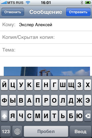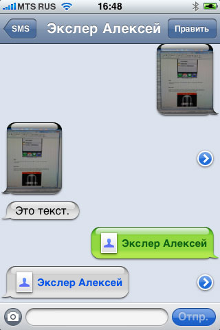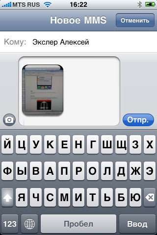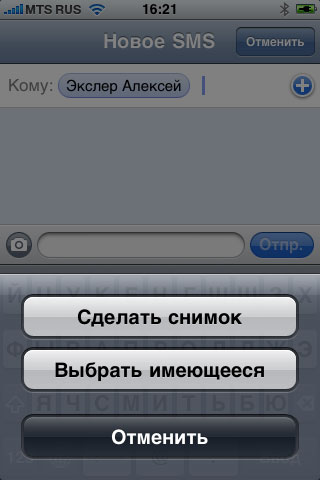 Теперь iPhone (только 3G) поддерживает MMS - отправку мультимедийных сообщений. Причем в связи с этим в окне отправки SMS/MMS появился значок фотоаппарата, при щелчке по которому можно выбрать изображение для отправки или сделать фото.