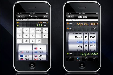 9-Toolbox - девять очень полезных инструментов. Бесплатная. Перевод друг в друга различных видов валют, расчет количества дней до того или иного праздника, список праздников, столярный "уровень", расчет процентов по кредитам, расчет критических дней (для мужчин на самом деле тоже актуально, если их подруги страдают боевым ПМС), расчет чаевых, перевод одних единиц измерений в другие.