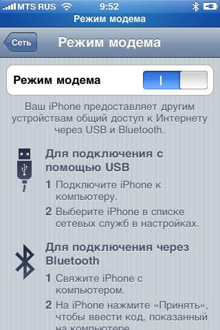 Зайти с айФона. Скачать профиль с сайта, установить. В Settings->General появится раздел "Profile" (ничего с ним делать не надо), в Settings->General->Network появится "Internet tethering (on/off)". "Режим модема" по русски.