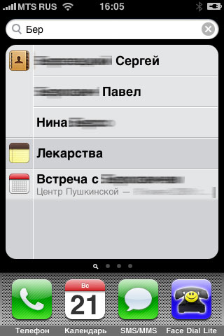 Теперь как бы нулевым экраном десктопа является окно поиска. Оно появляется при вторичном нажатии на кнопку Home или при пролистывании первого экрана вправо. Заданная строка поиска ищется в контактах, календаре, заметках, почте и текстовых документах.