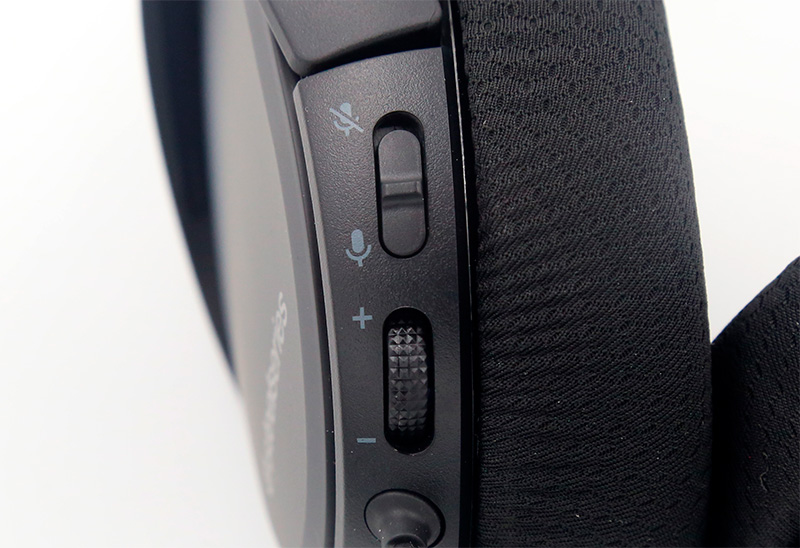 На левой чаше находятся элементы управления: включение-выключение микрофона, колесико регулировки громкости.