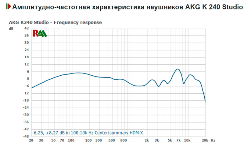 Амплитудно-частотная характеристика этих наушников (почерпнутая вот здесь). Некоторый подъем высоких после пяти тысяч герц часто наблюдается у мониторных наушников: так проще работать с вокалом.