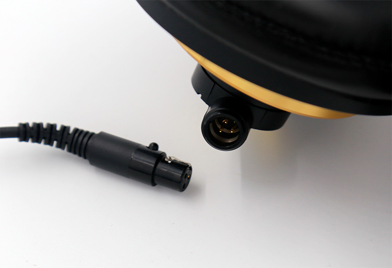 Кабель здесь отстегивающийся, причем, в отличие от других наушников с отстегивающимся кабелем, где кабель подключается в гнездо под minijack, здесь крепление - mini XLR. Коннектор кабеля вставляется в гнездо в определенном положении и защелкивается. Чтобы кабель отсоединить, нужно нажать на выступ. Кабель можно купить отдельно, но стоит он недешево.