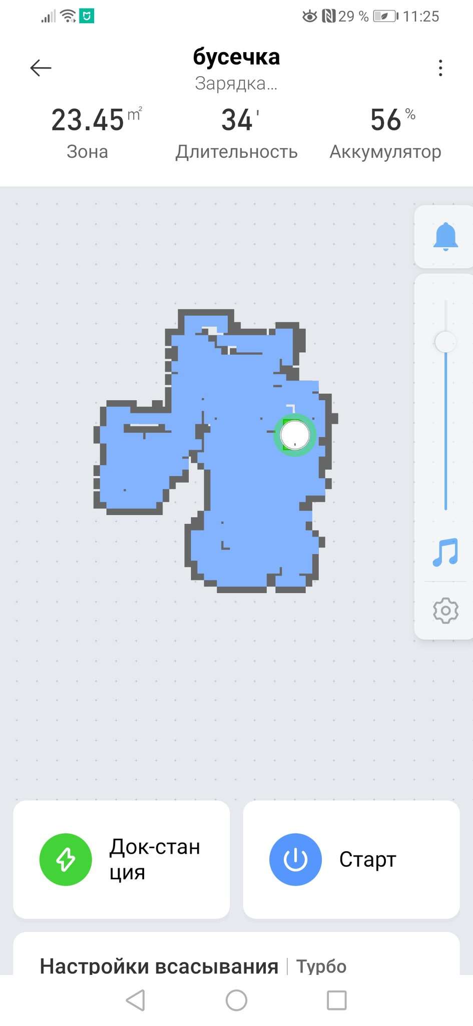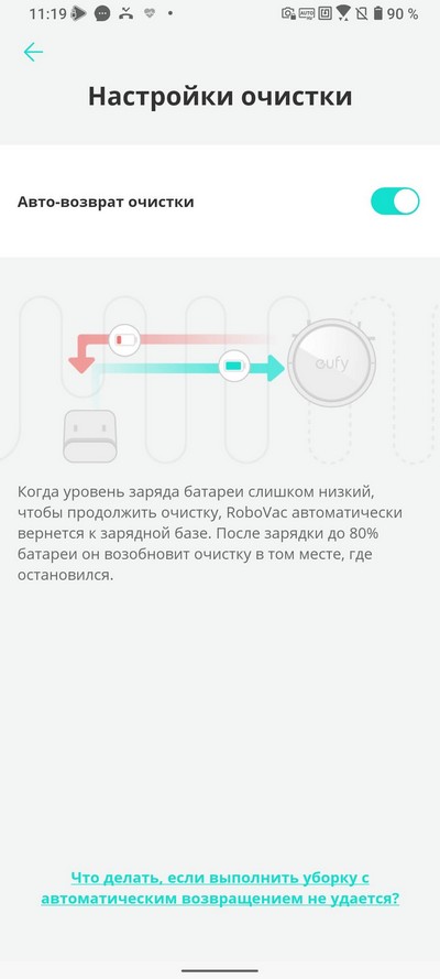 Включение автовозврата для подзарядки: если уровень слишком низкий, робот поедет на станцию, зарядится и продолжит уборку.