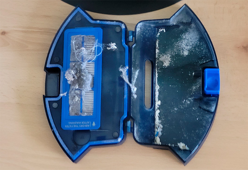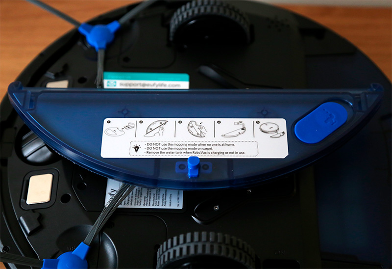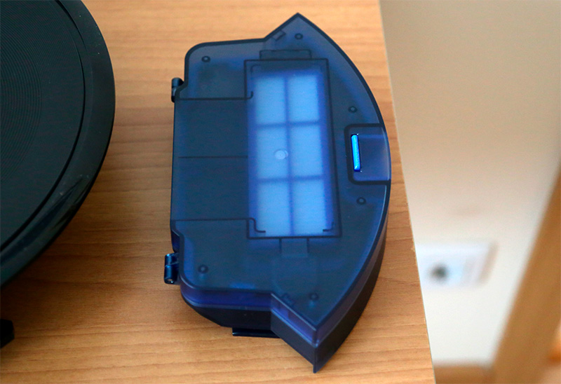 По поводу влажной уборки. Здесь применяется стандартная схема (у меня у беспроводного пылесоса есть похожая насадка): емкость, в которую заливается вода, и на эту емкость надевается насадка из микрофибры. В процессе уборки в насадку из емкости потихоньку просачивается вода и насадка протирает пол. Конечно, это не сравнить с полноценной влажной уборкой (в таком случае используется заметно больше воды и тряпка в процессе уборки неоднократно чистится), однако мелкую пыль и пыльцу такая насадка собирает вполне неплохо, и с ней явно лучше, чем без нее. Единственное, если роботу предстоит убирать большую площадь, то вода может закончиться раньше окончания уборки.