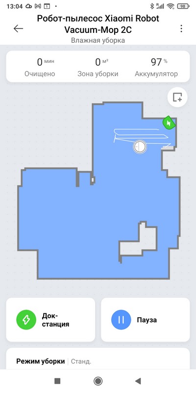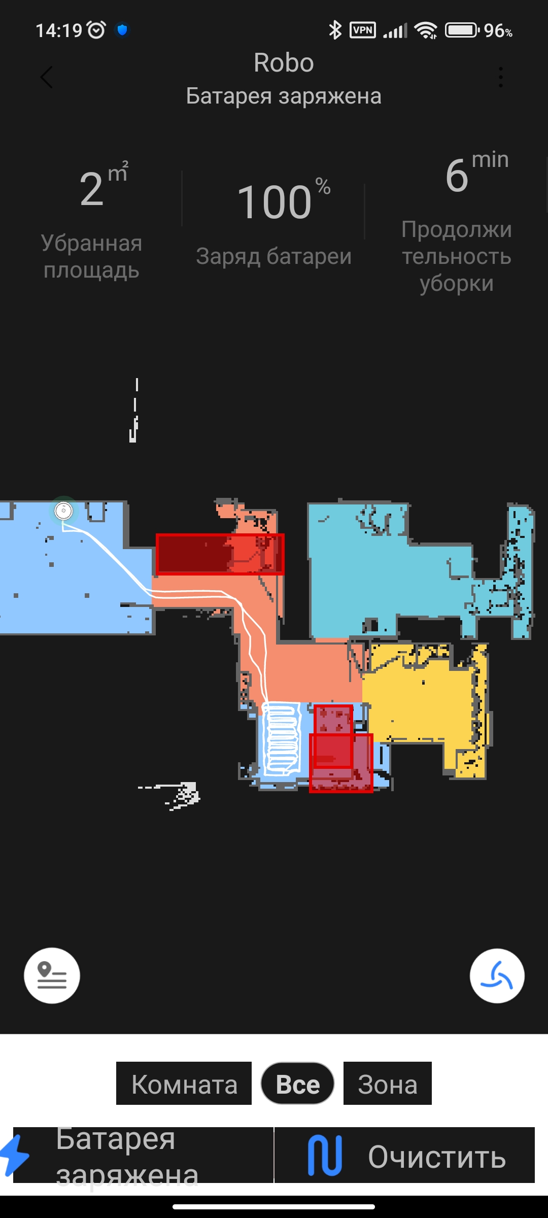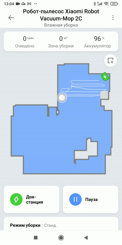 При последующих уборках здесь по построенной карте (если в помещении что-то меняется, то карта будет корректироваться) в реальном времени будет демонстрироваться процесс уборки.