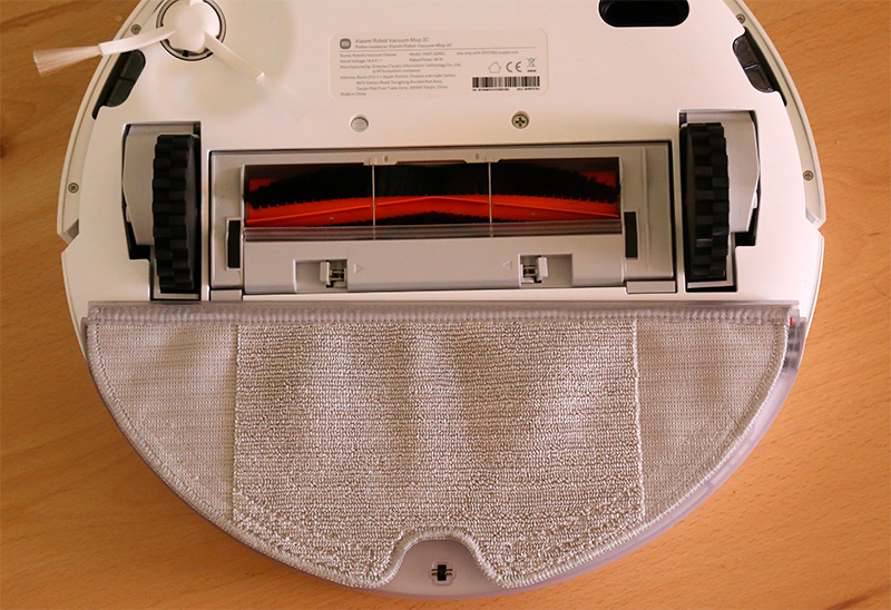 На нижней части расположены: колёсико направления, магнитные контакты для зарядки, боковая щетка, датчики падения, турбощётка, направляющие колёса, посадочное место для ёмкости с водой.