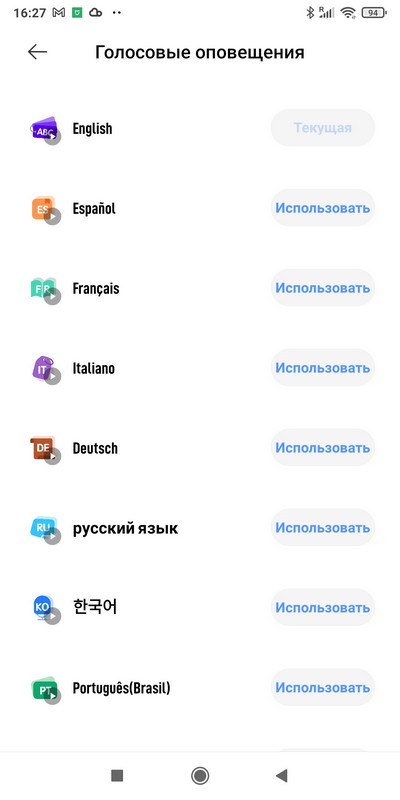 Настройки устройства. Язык голосовых оповещений (по умолчанию - английский).