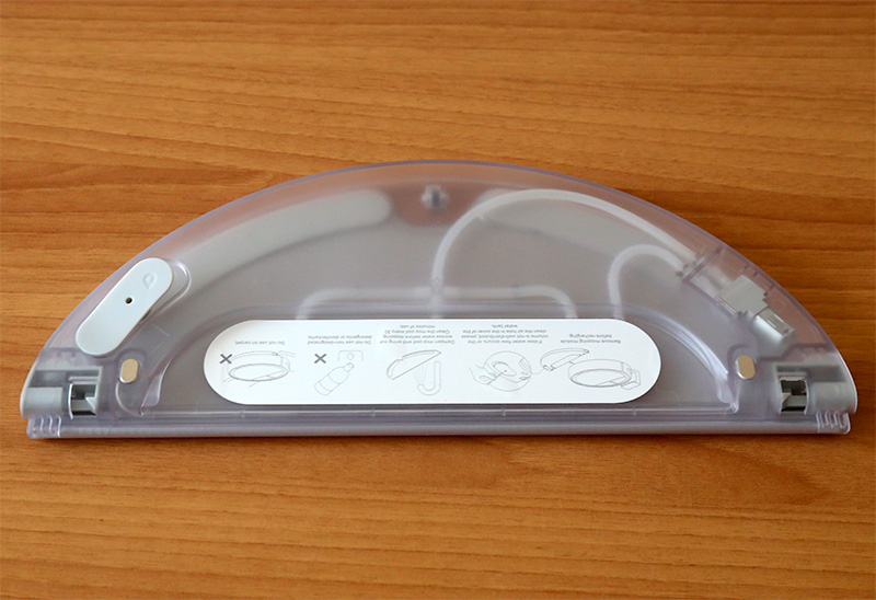 Резервуар для влажной уборки. В резервуар наливается вода, после чего он крепится на нижней крышке робота-пылесоса - с помощью двух магнитов и двух защёлок.