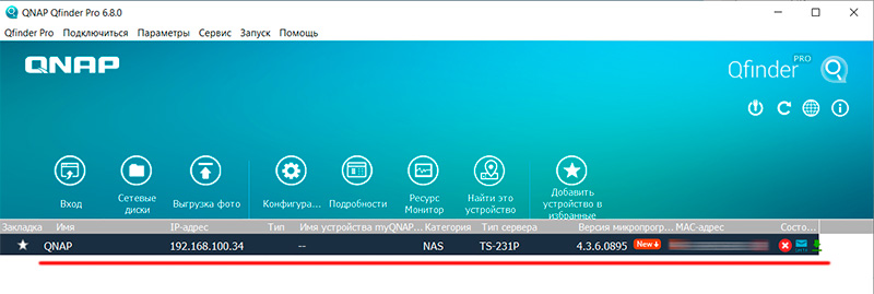 Для удобного обнаружения NAS в сети нужно воспользоваться программой Qfinder Pro, которую можно скачать с сайта производителя. Она обнаружит NAS, покажет его статус, и там нужно просто щелкнуть по названию накопителя, чтобы перейти в его админку в браузере.