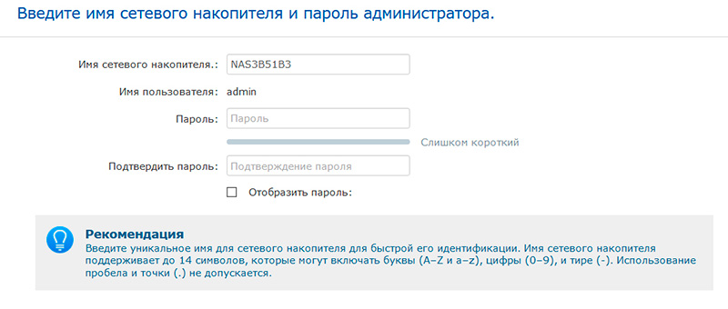 Задаем имя накопителя и пароль администратора.