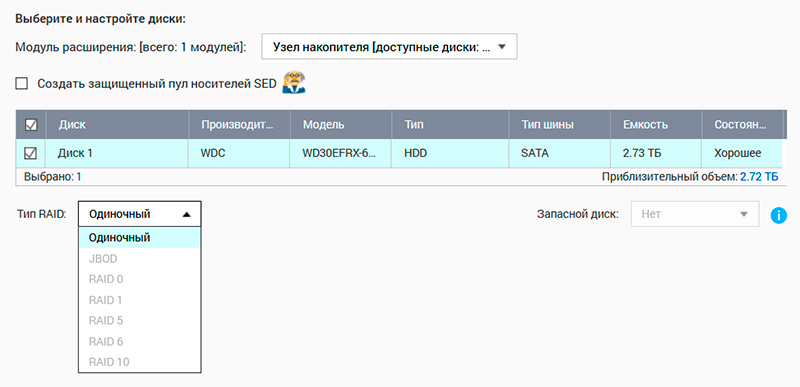 На последнем этапе при установленных двух дисках накопитель предложит выбрать конфигурацию дисков и файловую систему. Но у меня был установлен только один диск, поэтому, разумеется, на данном этапе мне ничего не предложили (и замечу, что NAS пул хранения с одним диском не стал создавать).