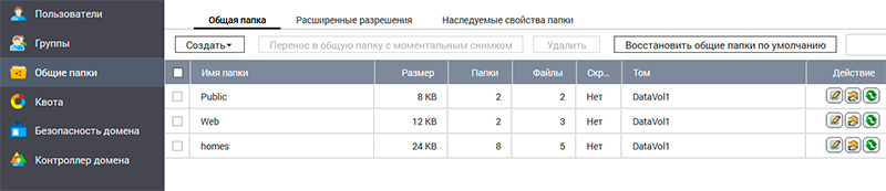 Теперь идем в раздел Пользователи - Общие папки. Там можно создавать свои папки пространства NAS, указывать, какому тому они принадлежат и какие виды доступа есть у пользователей по отношению к данной папке. Папки можно шифровать, синхронизировать с другими папками.