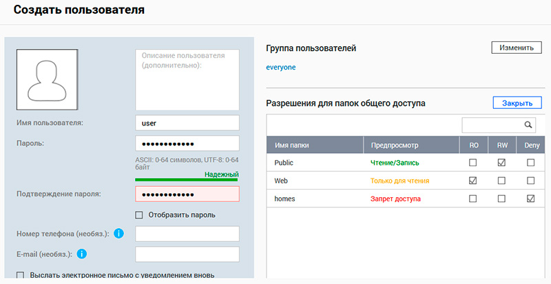 В разделе "Пользователи" заводятся пользователи NAS и для них задаются виды доступа к тем или иным папкам, также для пользователей можно задавать периоды действия паролей, выделять дисковые квоты. Для папок доступны следующие виды доступа: чтение/запись, только чтение, запрет доступа.