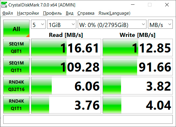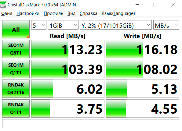 Прогнал на скорость подключенного в док-станции через NAS диска. Тут прям как-то даже все хорошо.