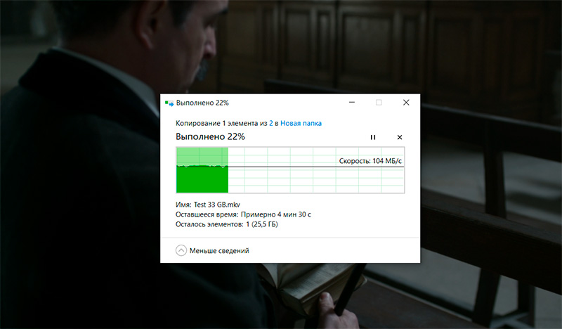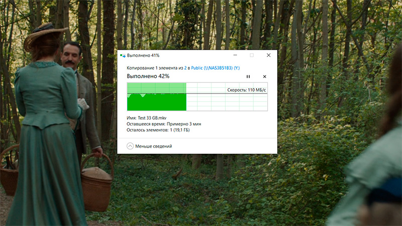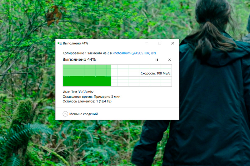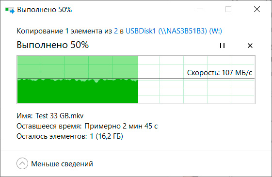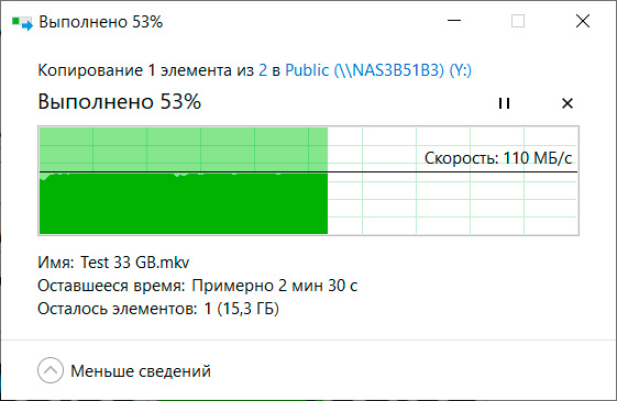 Копирование огромного (32 ГБ) файла с компьютера на внутренний диск NAS. Скорость очень четко держалась на 110-112 мегабайтах в секунду - очень хорошо.