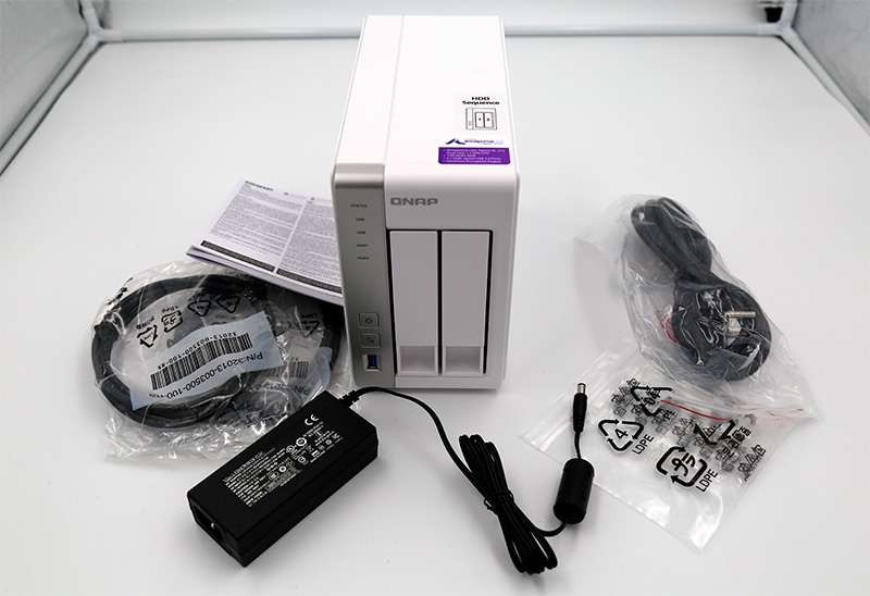 В комплекте - NAS, адаптер питания, два сетевых кабеля, крепеж для дисков, инструкция на многих языках.