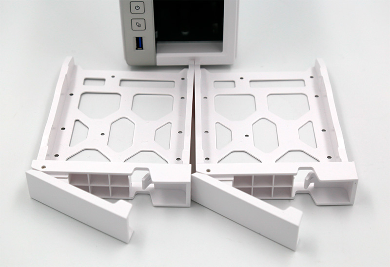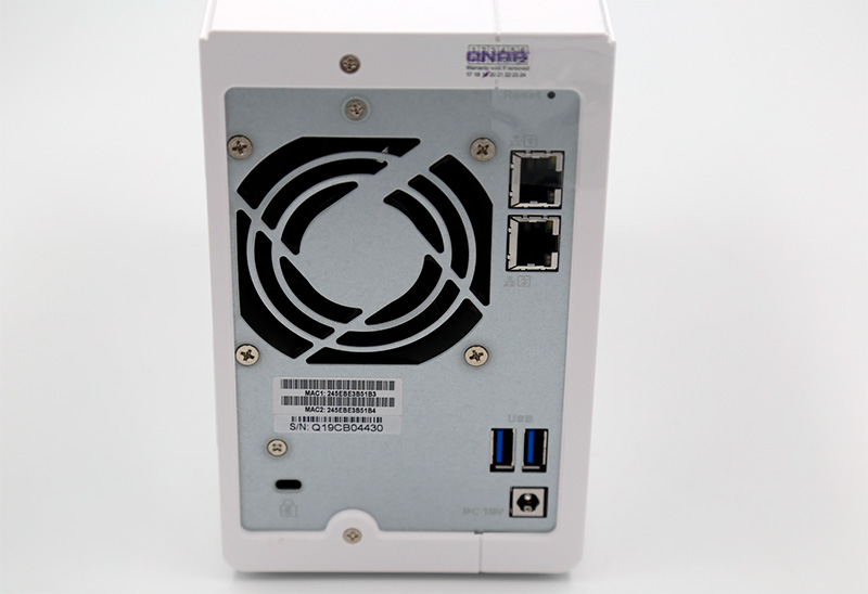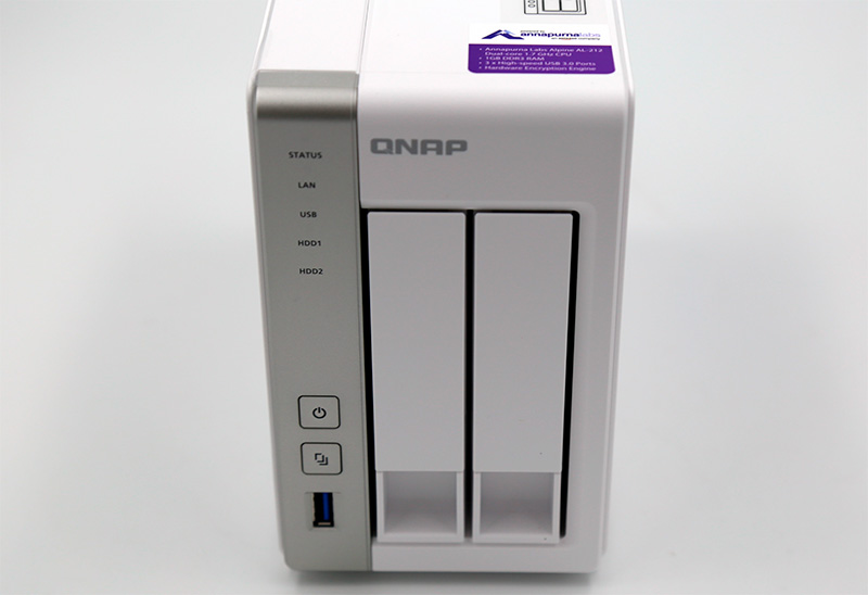 Металлический корпус, белый и серый матовый пластик. На верхней части наклейка, показывающая, какой диск является первым (это важно, на него устанавливается конфигурация). На передней панели находятся пять светодиодов: режим работы, сеть, подключенные по USB устройства и два установленных в NAS диска. Цветом и режимом мигания светодиоды могут сообщать об определенных проблемах. Также о состоянии устройства и о проблемах сообщают определенные сигналы зуммера.