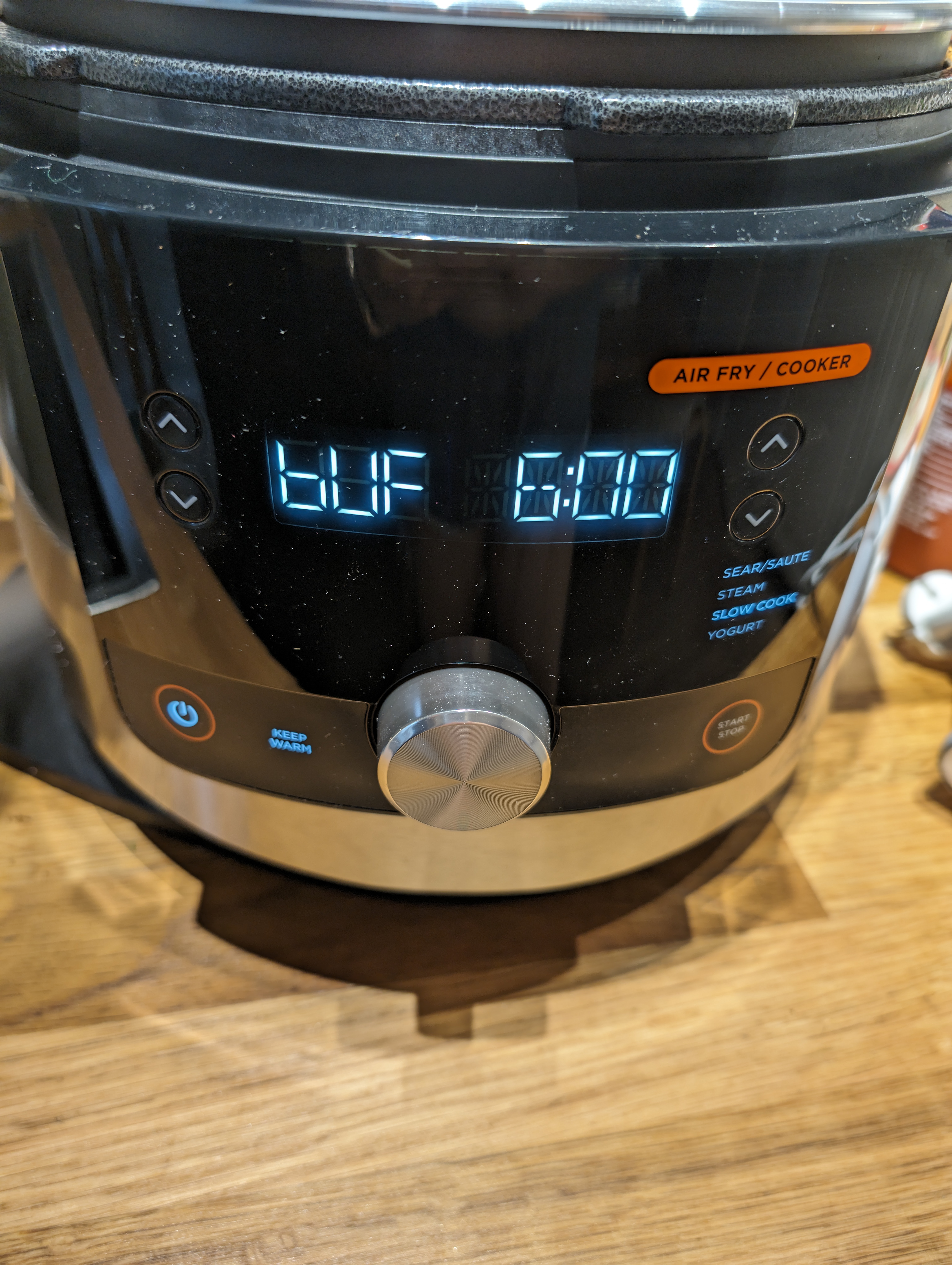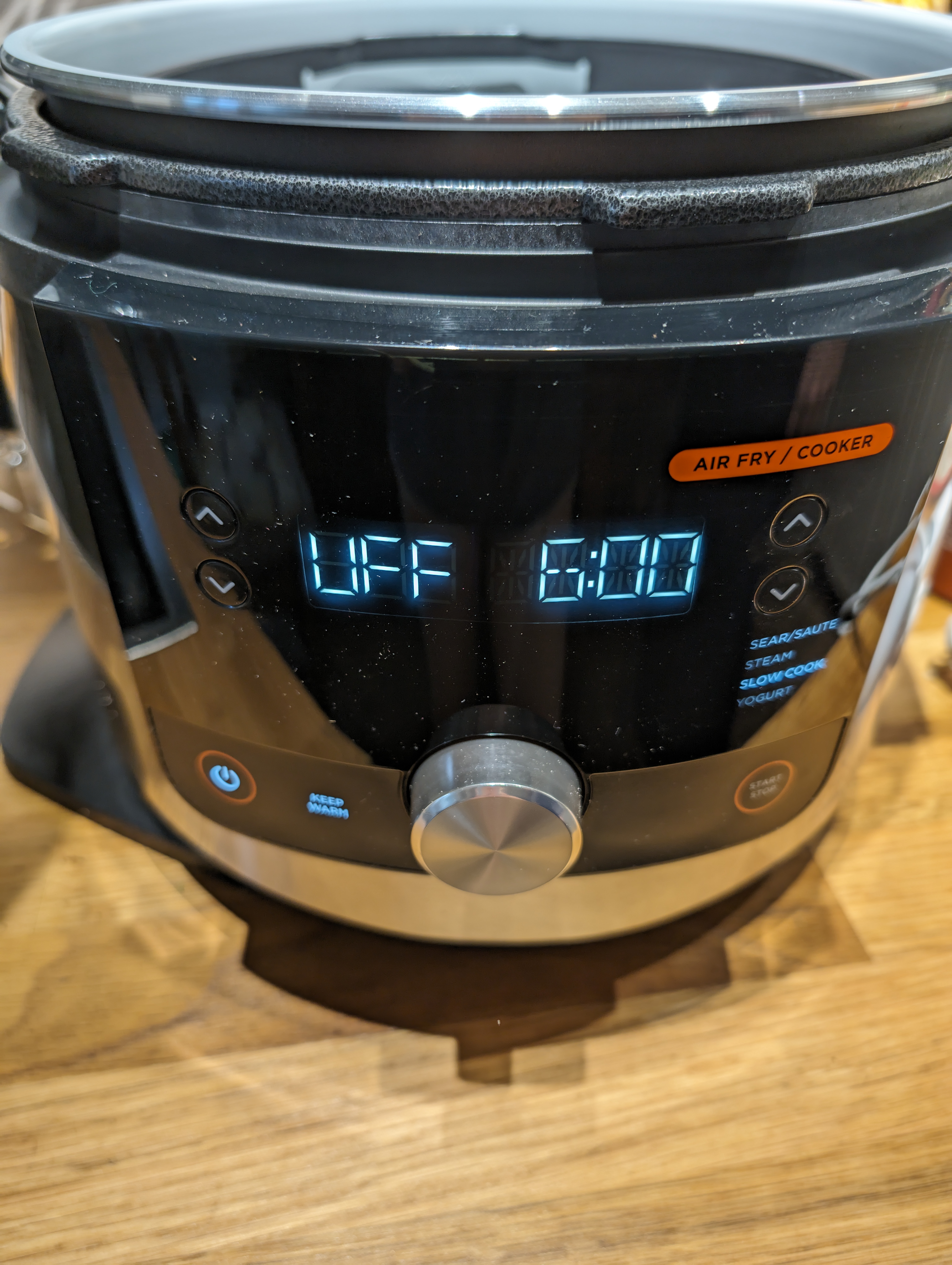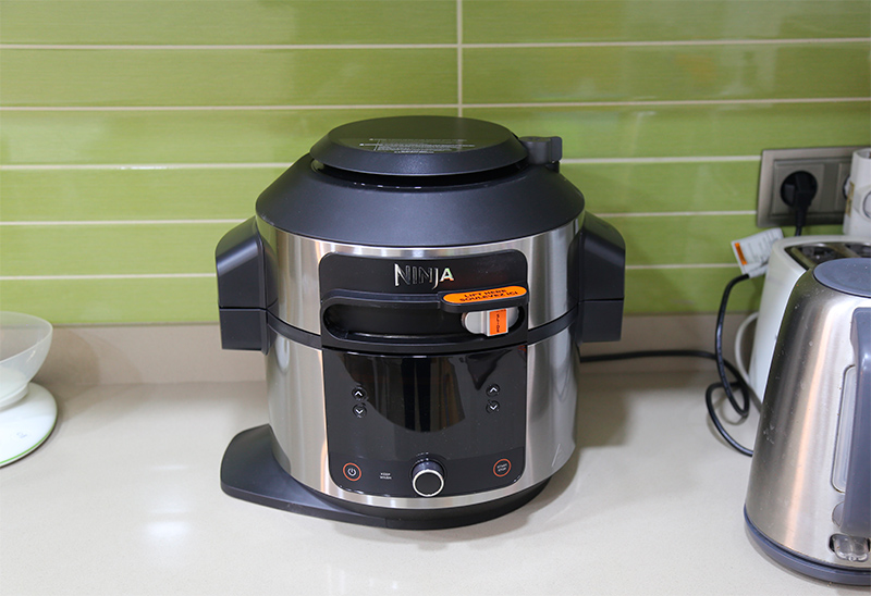 Называлось устройство Ninja Foodi Multi-Cooker, я к нему в свое время присматривался, но так и не купил, причем по очень простой причине: для приготовления под давлением пара там нужно было использовать отдельную съемную крышку, для чего крышка с тэном и вентилятором откидывалась и устанавливалась вертикально, а на моей кухне такой вариант просто никак не прокатывал по высоте, потому что крышку не давал поставить вертикально кухонный шкафчик. Ну и кроме того, возиться со съемной крышкой - это же ее тоже надо где-то на кухне держать под руками, что неудобно.