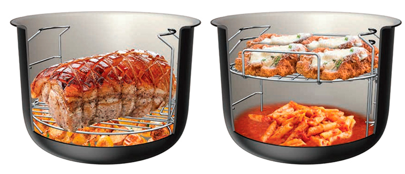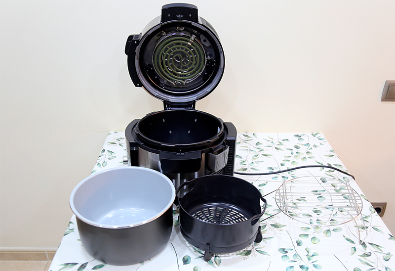 В комплекте: само устройство, чаша для готовки объемом 6 л, реверсивная решетка, воздушная корзина для жарки, контейнер для сбора конденсата, руководство по эксплуатации, руководство по быстрому запуску, руководство по вдохновению (сборник рецептов).