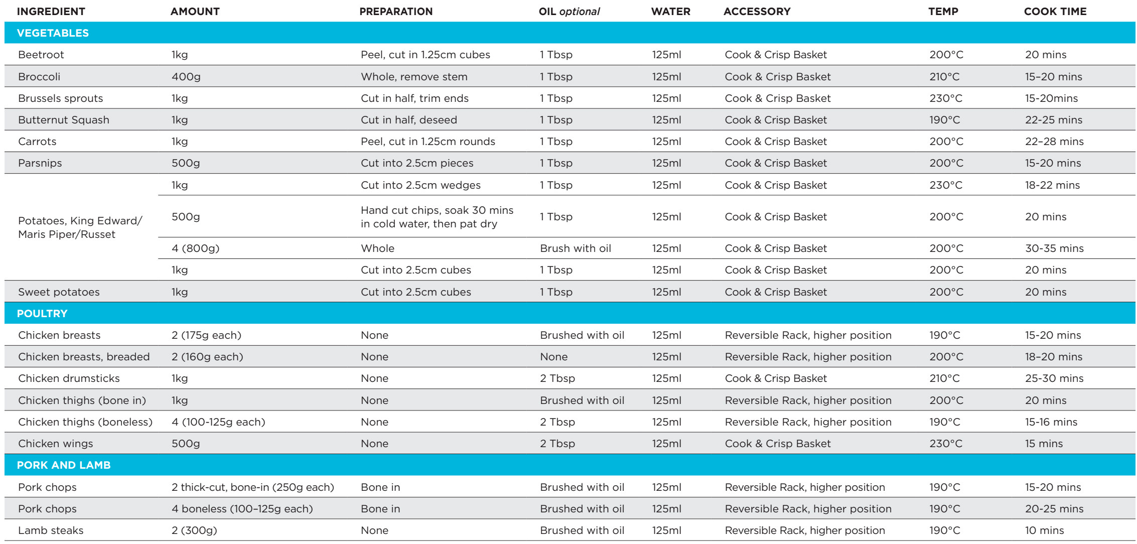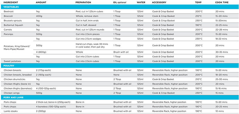 В книге рецептов, которая входит в комплект, для всех трех режимов приготовления приводятся вот такие таблички, в которых указываются примерные режимы - температура, время, положение в чаше - для различных продуктов. По ним первоначально удобно ориентироваться, но, конечно, потом в процессе вы подберете для себя свои оптимальные режимы.