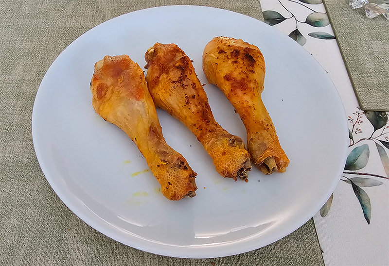Вот результат. На самом деле получилось прям хорошо, действительно не хуже чем с обычным охлажденными голенями. Думаю, что с замороженными крылышками тоже будет хорошо, но я не проверял, потому что замороженные продаются целиком, а охлажденные - разделенные на две части и без кончиков, а такие запекать удобнее.