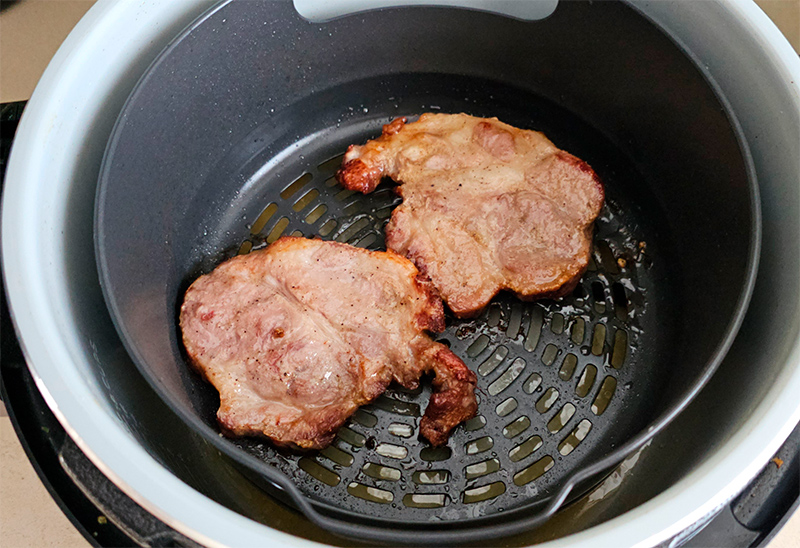 А вот свиную шейку предварительно желательно мариновать для этого режима, особенно если она недостаточно жирная. Но, впрочем, от куска зависит. Вот это я делал безо всякого маринования - получилось отлично. И готовится очень быстро, если нарезать нетолстыми кусками: 180 градусов, 10 минут, не больше.
