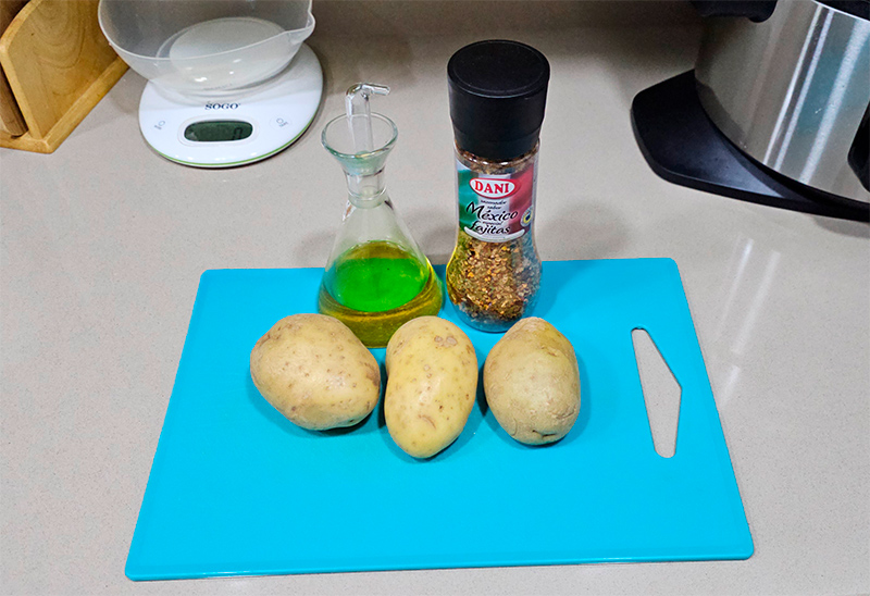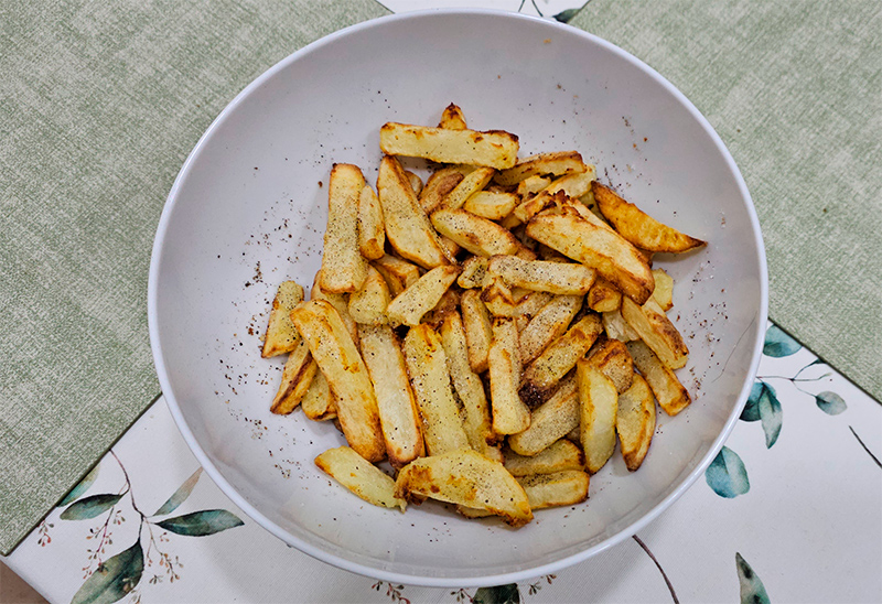 Положить в корзину, слегка сбрызнуть оливковым маслом (а можно вообще без масла, но с маслом лучше), не солить: 200 градусов - на 30 минут. Через 15 минут как следует перемешать, дальше желательно помешать один-два раза - через 5-7 минут. Перед подачей посолить и поперчить (ну или посыпать смесью фахитас). Получается классно, даже я оскоромился - это тебе не ресторанная картошка-фри.