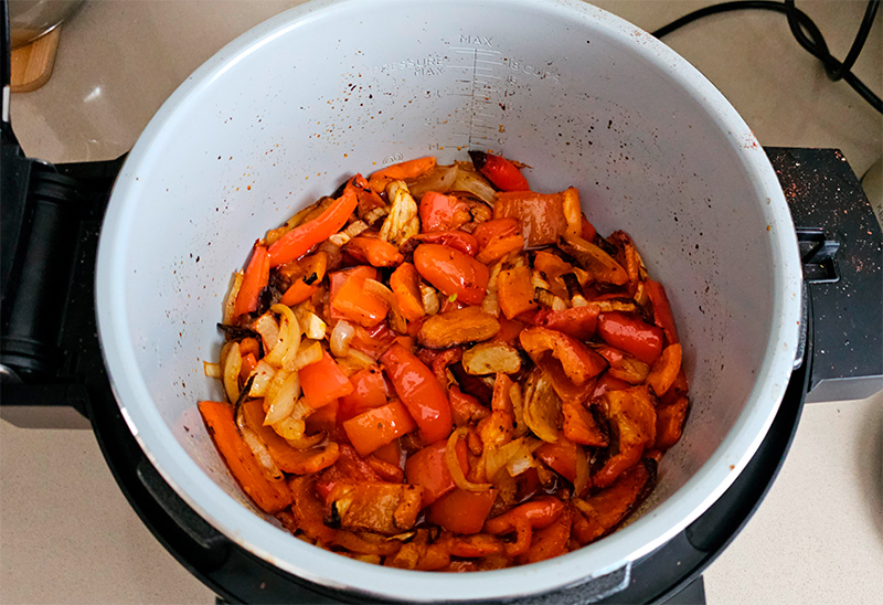 Также мне понравилось, как в аэрогриле делается мое обычное овощное рагу из сладких перцев. Оно получается по-другому, но тоже очень вкусно, причем готовится значительно быстрее, чем в тажине.