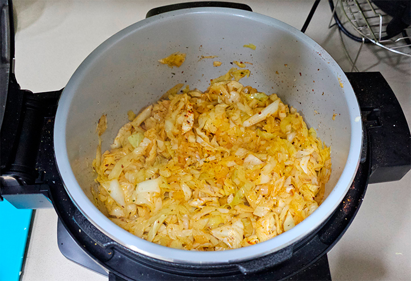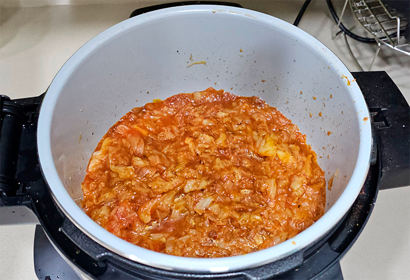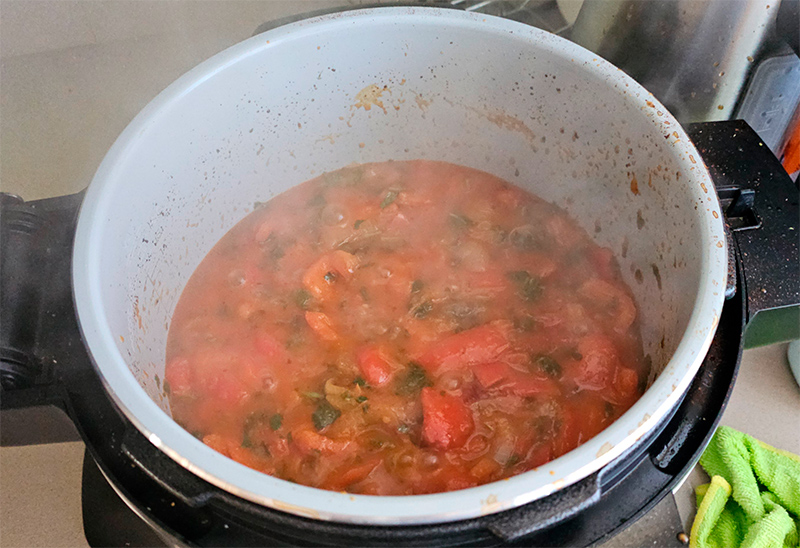 Рецепт довольно простой. В режиме жарки наливаем оливковое масло, туда режем половинку луковицы и пару долек чеснока, обжариваем. Далее туда режем крупные болгарские перцы (четыре штуки) и порезанную на дольки луковицу. Обжариваем. Солим, специи по вкусу (я кладу красный сладкий перец, красный острый перец паприка, кайенский перец, прованские травы).