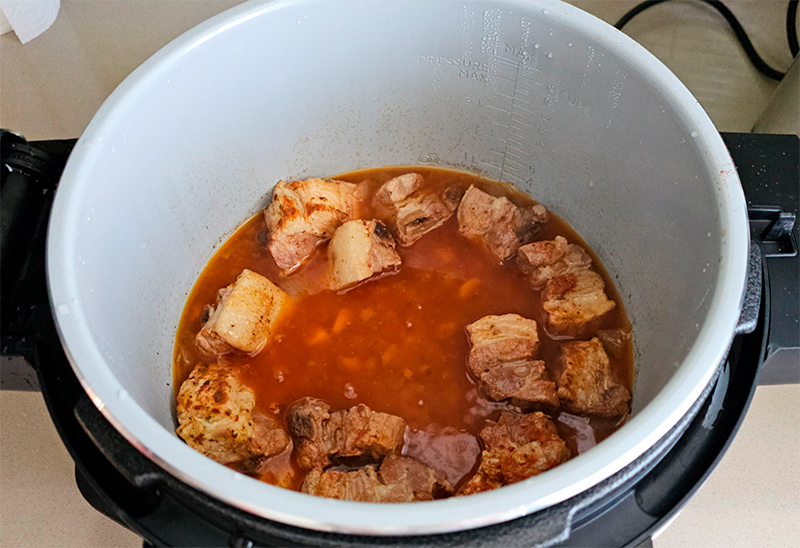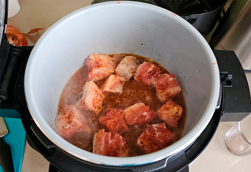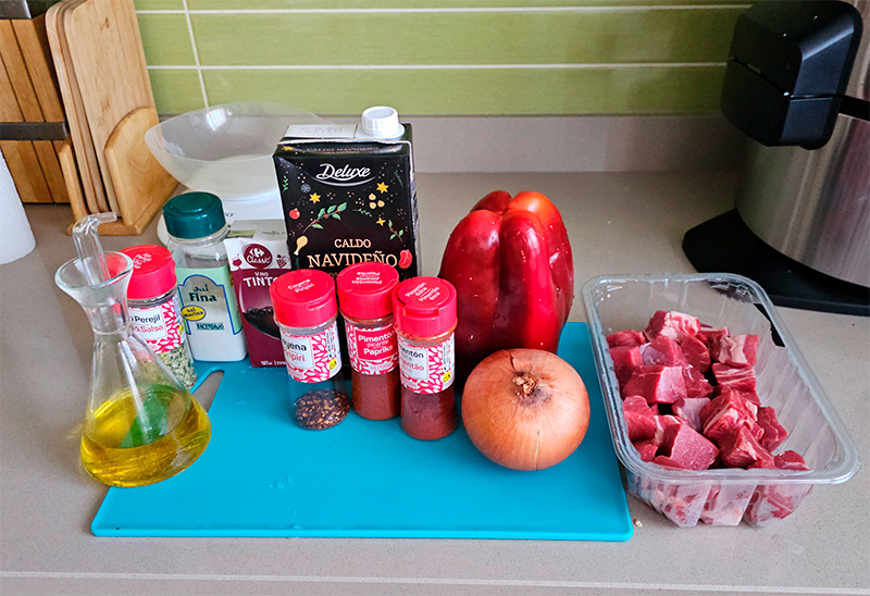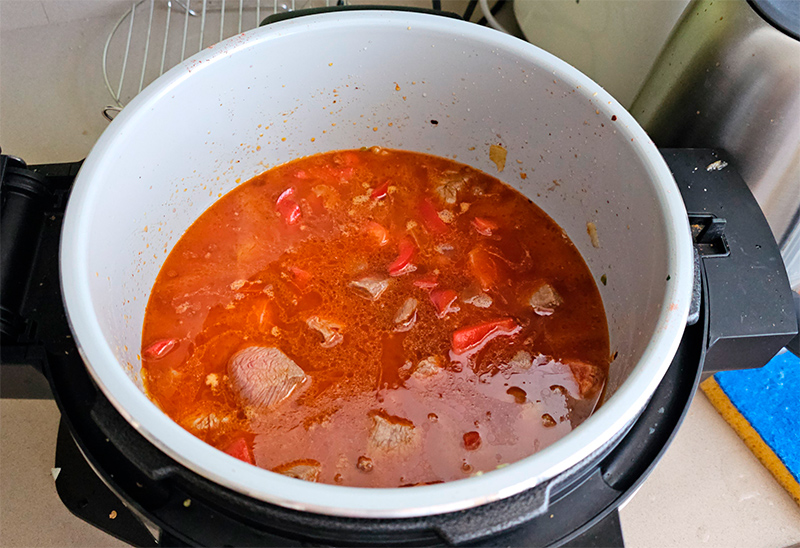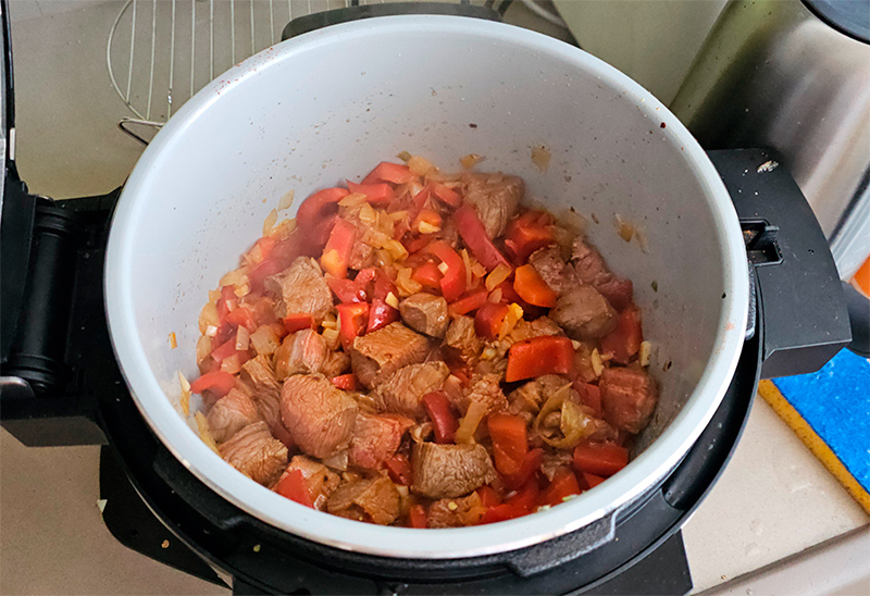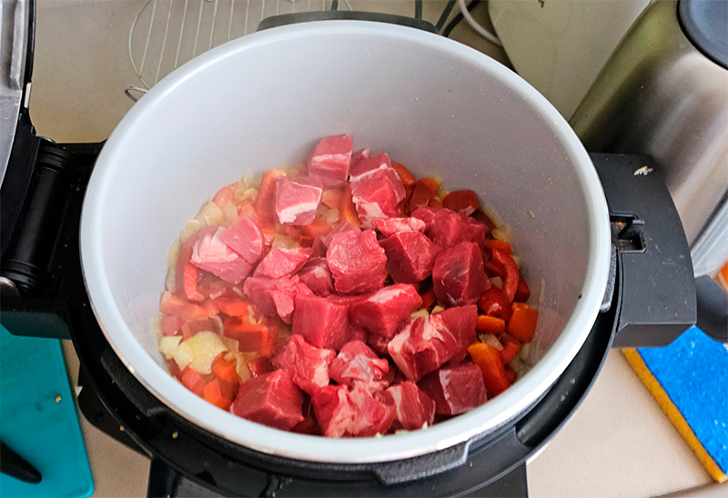 Тут много всего можно готовить, но я этот режим редко использую. Для тестирования этого режима приготовил говядину - типа гуляша. Купил дешевую говядину кусочками, взял здоровый сладкий перец, лук, специи (три вида перцев), оливковое масло, готовый куриный бульон, красное вино для готовки.
