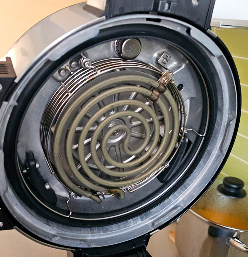 Температура меняется от 150 до 240 градусов, время - до 1 часа. В чашу наливается вода, продукт помещается на решетку или в корзину. После старта устройство сначала доводит воду до кипения, после чего включает аэрогриль и отсчитывает время.