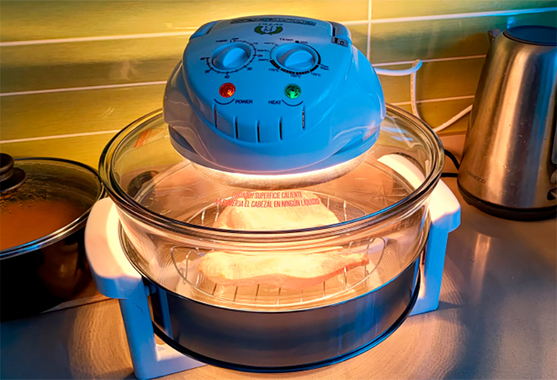 Работает как духовка для выпечки. Регулируется температура от 120 до 210 градусов, и время до 4 часов.