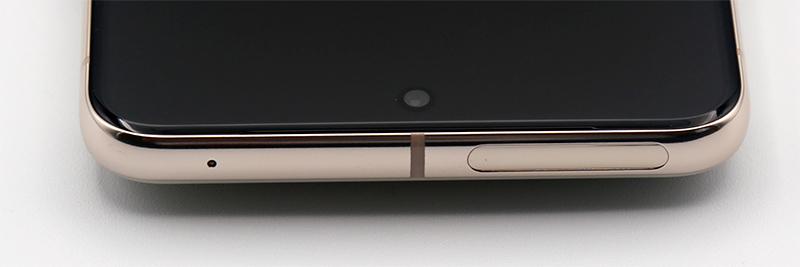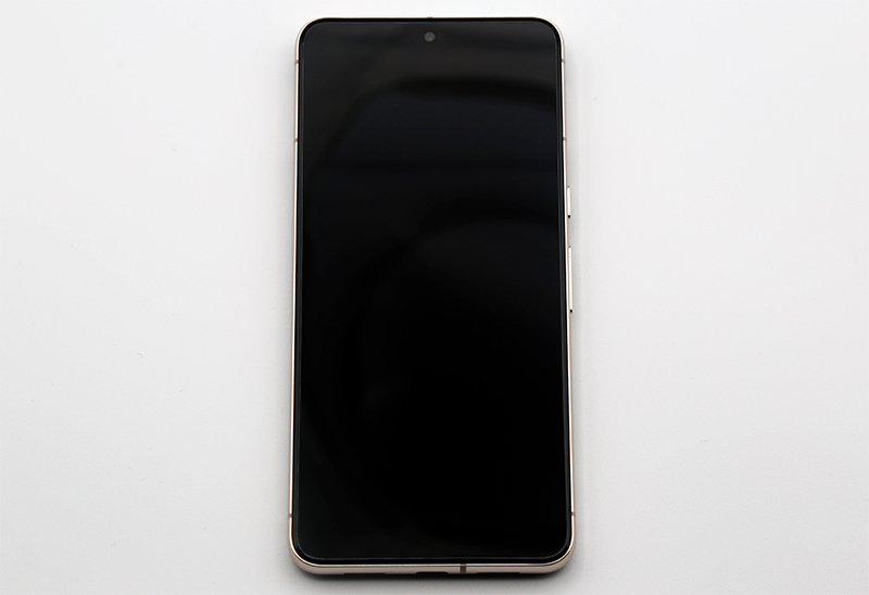 Лицевая часть. Края экрана, в отличие от предыдущей модели, теперь не скошены. Селфи-камера расположена в отверстии по центру верхней части экрана. Дисплей покрыт закаленным стеклом Gorilla Glass Victus, рама смартфона изготовлена из алюминиевого сплава.